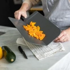 koziol faltbares Schneidebrett SNAP in grau. Das Schneidebrett mit praktischer Klappfunktion zum sicheren Schütten macht Schneiden, Kochen und Braten einfacher. Das Brett kommt in 2 Größen: in S besonders handlich für Kräuter, Zwiebeln und kleine Mengen Gemüse, bei der größeren Variante L rutschen an der mittigen Falz auch größere Stückchen Richtung Topf.