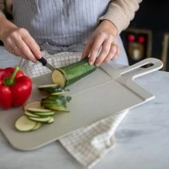 koziol faltbares Schneidebrett SNAP in sand. Das Schneidebrett mit praktischer Klappfunktion zum sicheren Schütten macht Schneiden, Kochen und Braten einfacher. Das Brett kommt in 2 Größen: in S besonders handlich für Kräuter, Zwiebeln und kleine Mengen Gemüse, bei der größeren Variante L rutschen an der mittigen Falz auch größere Stückchen Richtung Topf.