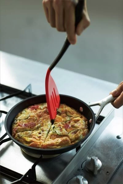 Die schräge, abgeflachte Kante des Le Creuset Pfannenwenders sorgt für ein einfaches Aufnehmen und Wenden von Speisen. Mit dem festen, geraden Kunststoffeinsatz können Bratensatz und angehaftete Speisen leicht gelöst werden.