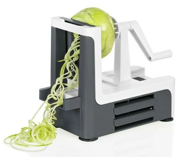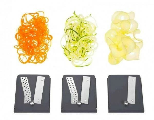 - inklusive 3 austauschbare Messereinsätze in integrierten Aufbewahrungsfächern (mit 2 und 3 mm Spaghetti-Klinge & glatter Spiralenklinge)