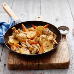 In der gusseisernen Bratpfanne mit Holzgriff von Staub können saftige Steaks, krosser Fisch und Gemüsegerichte besonders stilecht zubereitet werden. Gusseisen bietet den Vorteil, dass es Hitze lange speichert und ideal zum krossen und scharfen Anbraten ist.