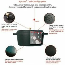 - Effizientes, selbständiges Begießen der Speisen durch das Noppensystem auf der Deckelunterseite; die spezifische Form des Deckels, sein Gewicht und die Noppen sorgen dafür, dass die Feuchtigkeit nicht aus dem Staub Bräter entweicht.