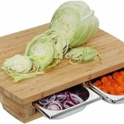 Meal Prep leicht gemacht! Das Arbeitsbrett eignet sich dank der integrierten Edelstahl-Auffangschalen ideal zum Vor- und Zubereiten von Speisen. Sie können Zutaten und Abfall sauber separieren. Praktisch: Das Schneidbrett ist auch separat einsetzbar. Außerdem erlauben Griffmulden den Einsatz von Tellern und Schüsseln.